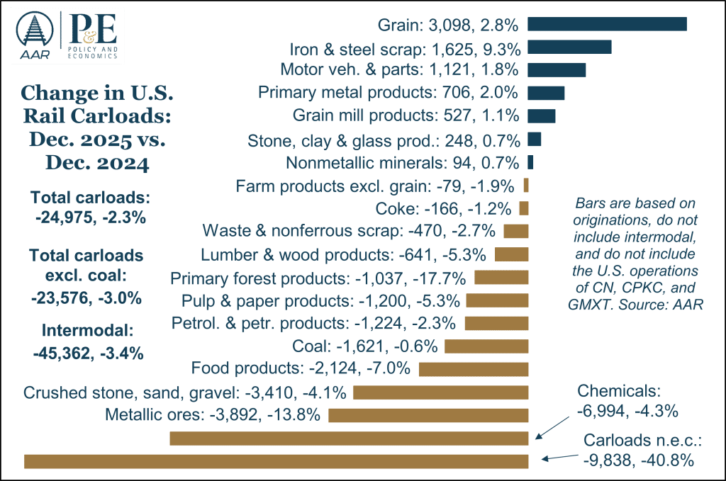 - Carload Counterbalance. In December, total year-over-year carloads fell 2.3%. Gains in grain, steel, and autos were offset by declines in chemicals, ores, and crushed stone and sand.