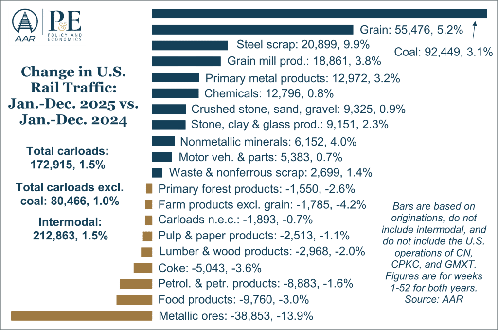 U.S. carloads of grain were up 2.9% in December 2025 over December 2024, their 10th year-over-year increase in 2025 and their 21st in the 24 months since January 2024. For the full year 2025, U.S. grain carloads totaled 1.12 million, up 5.2% (more than 55,000 carloads) over 2024 and the most since 2021. U.S. grain carloads were higher in 2025 mainly because U.S. grain exports were higher. If grain exports rise in 2026, grain carloads will probably rise too; if grain exports fall, there’s a good chance rail carloads of grain will fall as well. In 2025, grain accounted for 9.8% of U.S. non-intermodal rail volume, close to a record high.