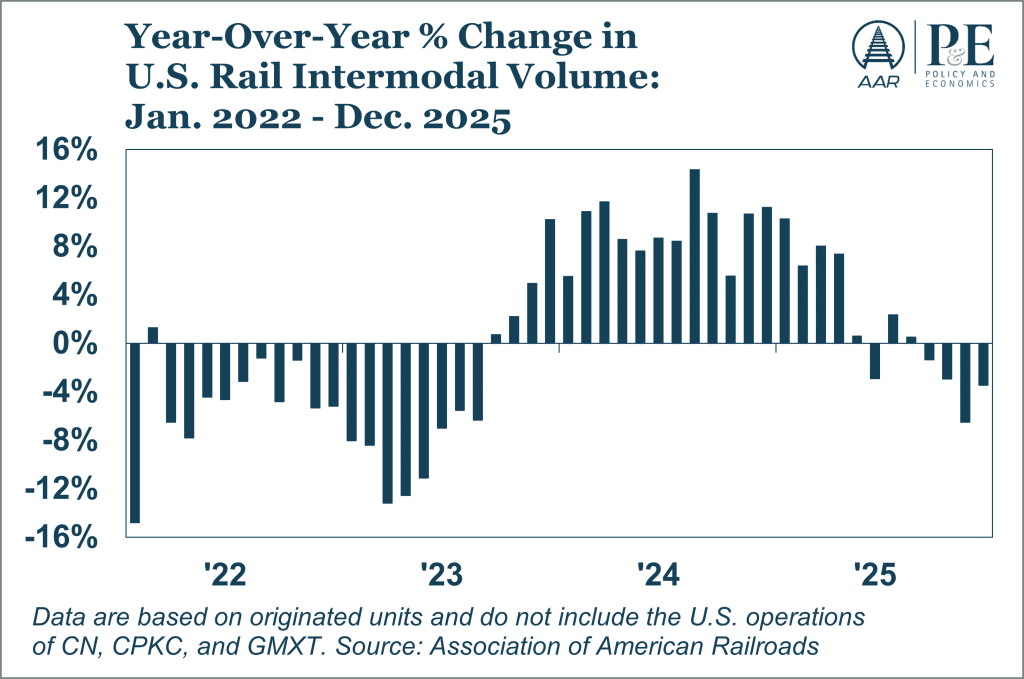 - Intermodal Softening.U.S. rail intermodal volume fell 3.4% in December 2025 from December 2024, the fourth consecutive month of year-over-year intermodal decline.
