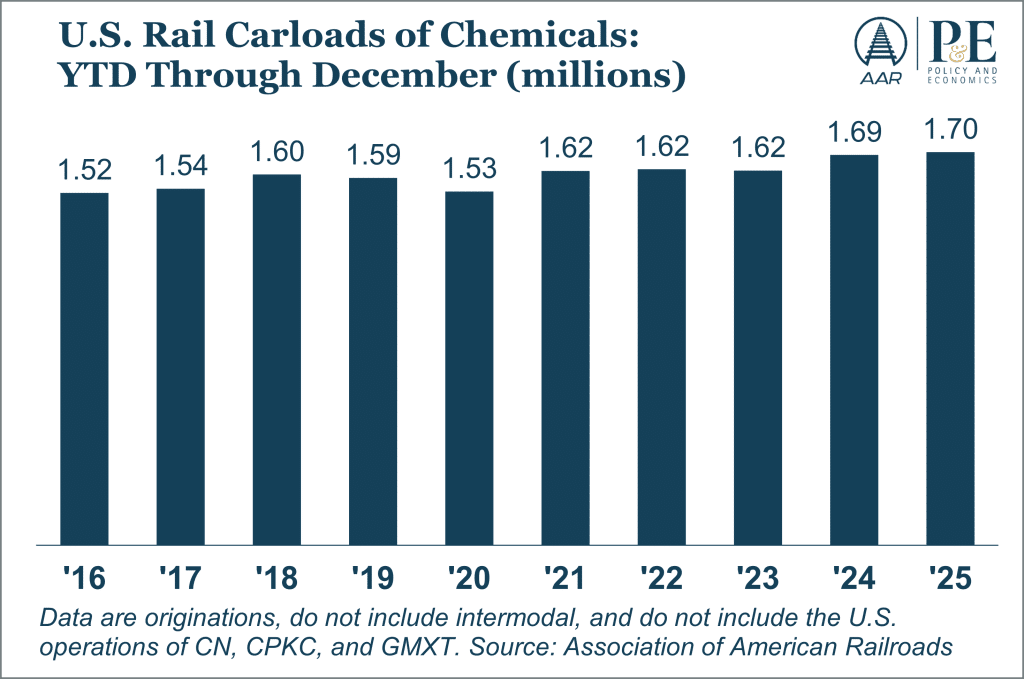 U.S. carloads of chemicals finished 2025 on a down note, falling 4.3% in December from a year earlier and 1.3% in Q4 — their first quarterly decline since Q2 2023. For the year, U.S. chemical carloads totaled 1.70 million, up 0.8% from 2024 and the most ever, thanks to gains earlier in the year.