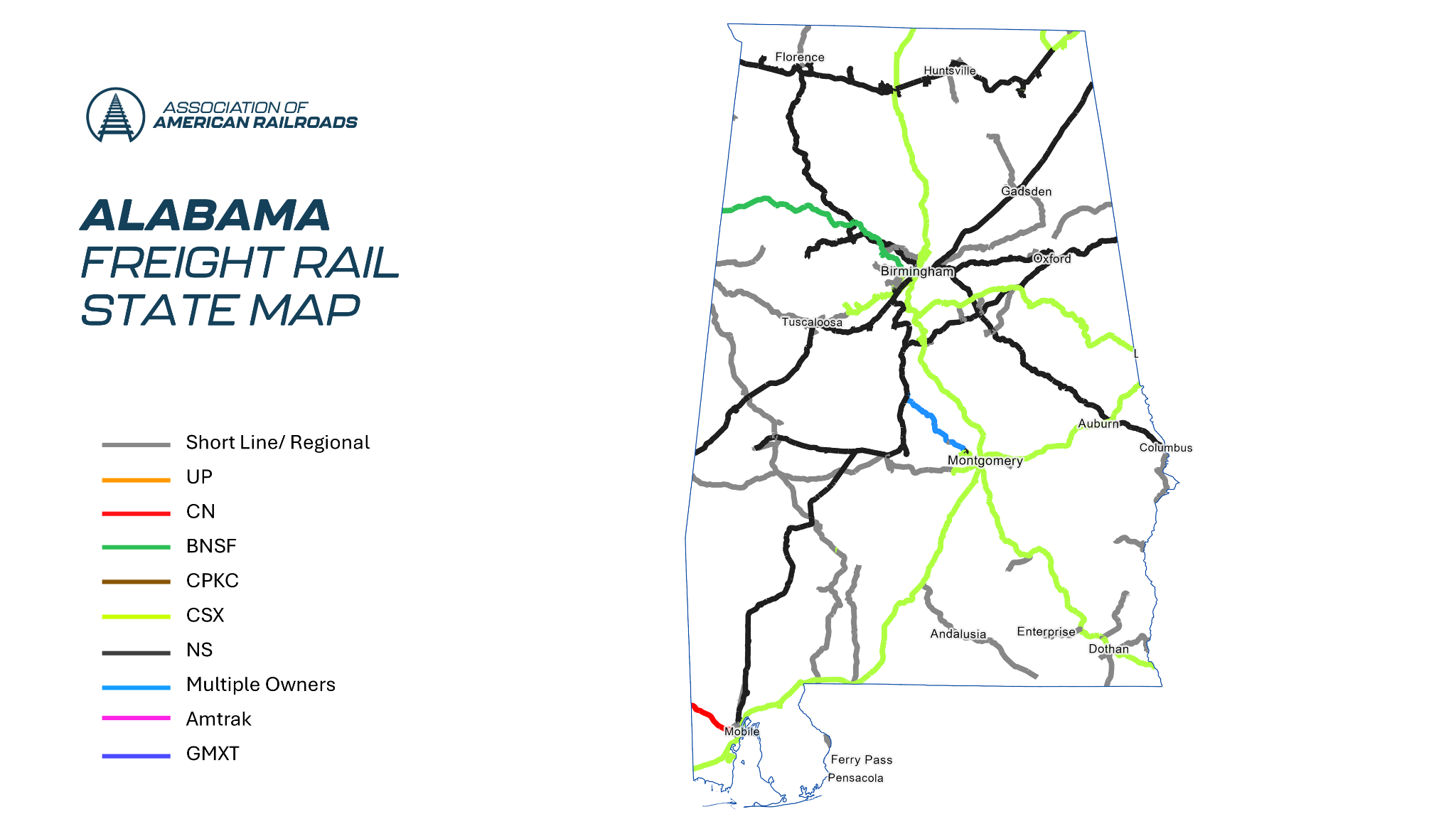 - Trucks off the Road: It would have taken 8 million trucks to handle the freight that moved by rail in Alabama in 2022.