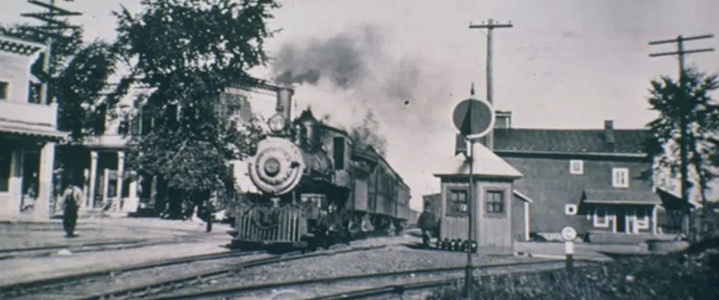 A Peanut Line train arrives in Holcomb from the west in the early 1900s. Postcard photo from the collection of Preston E. Pierce.