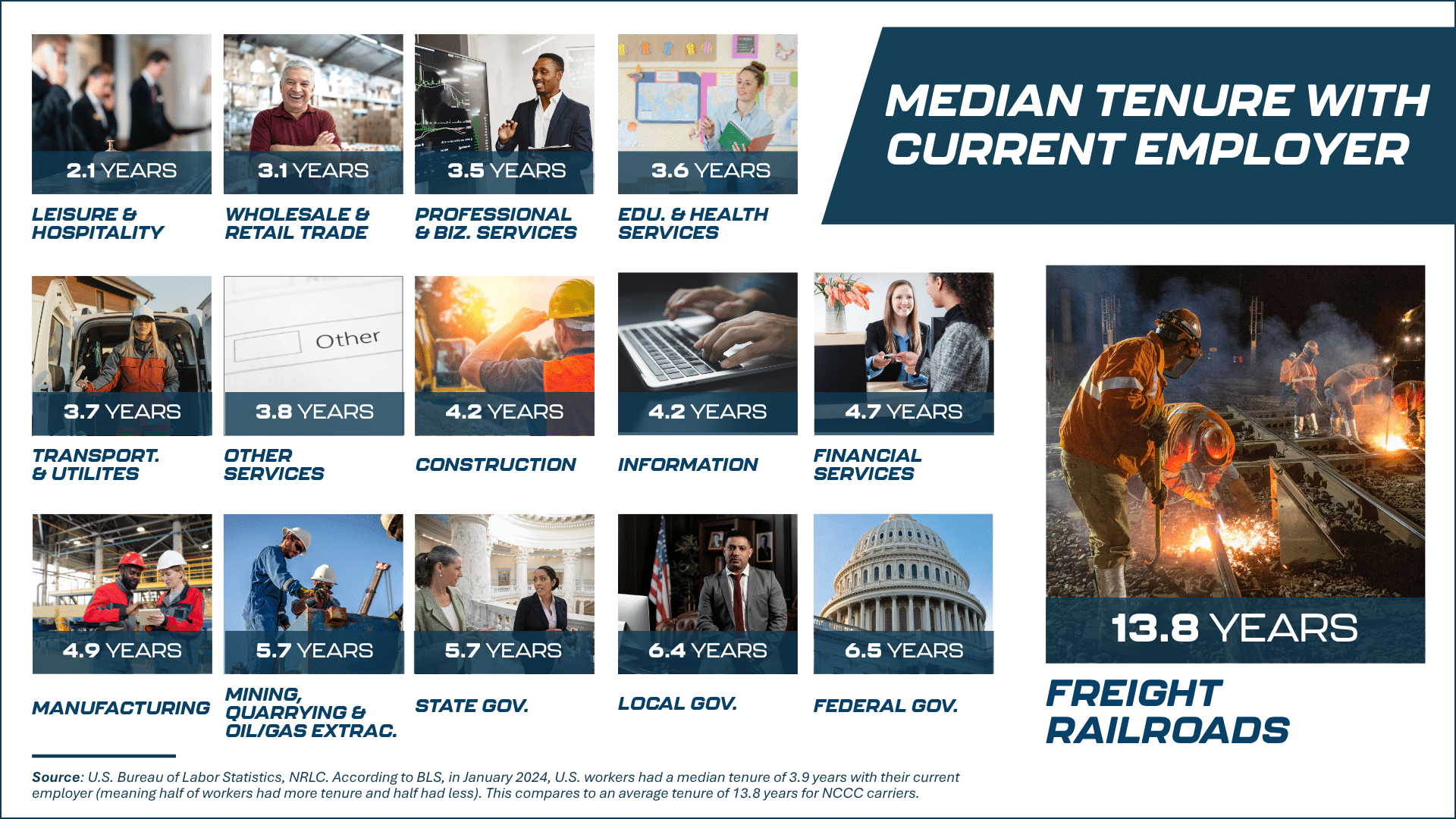 - The median tenure of freight railroaders is 14 years—three times the national average.