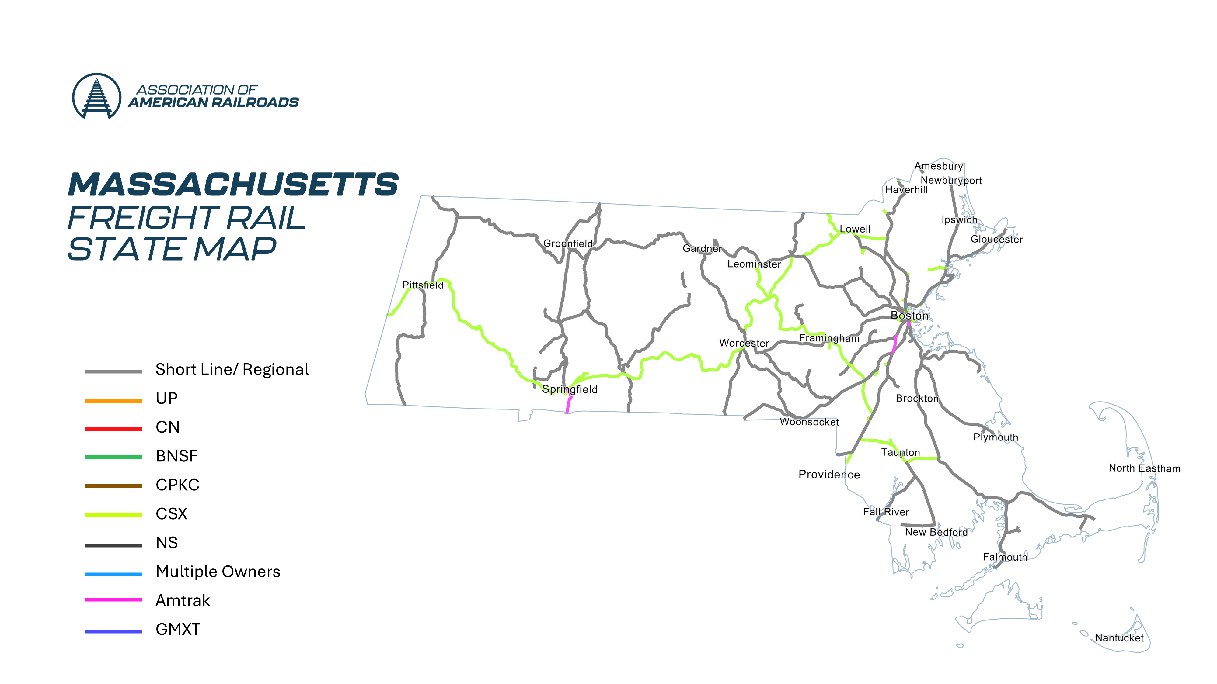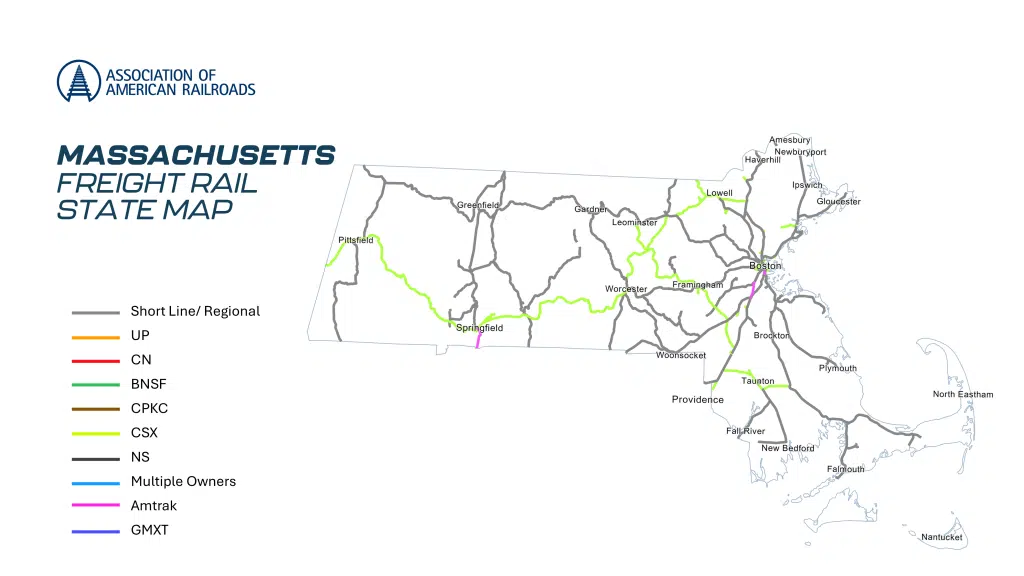 - Trucks off the Road: It would have taken 750,000 trucks to handle the freight that moved by rail in Massachusetts in 2022.