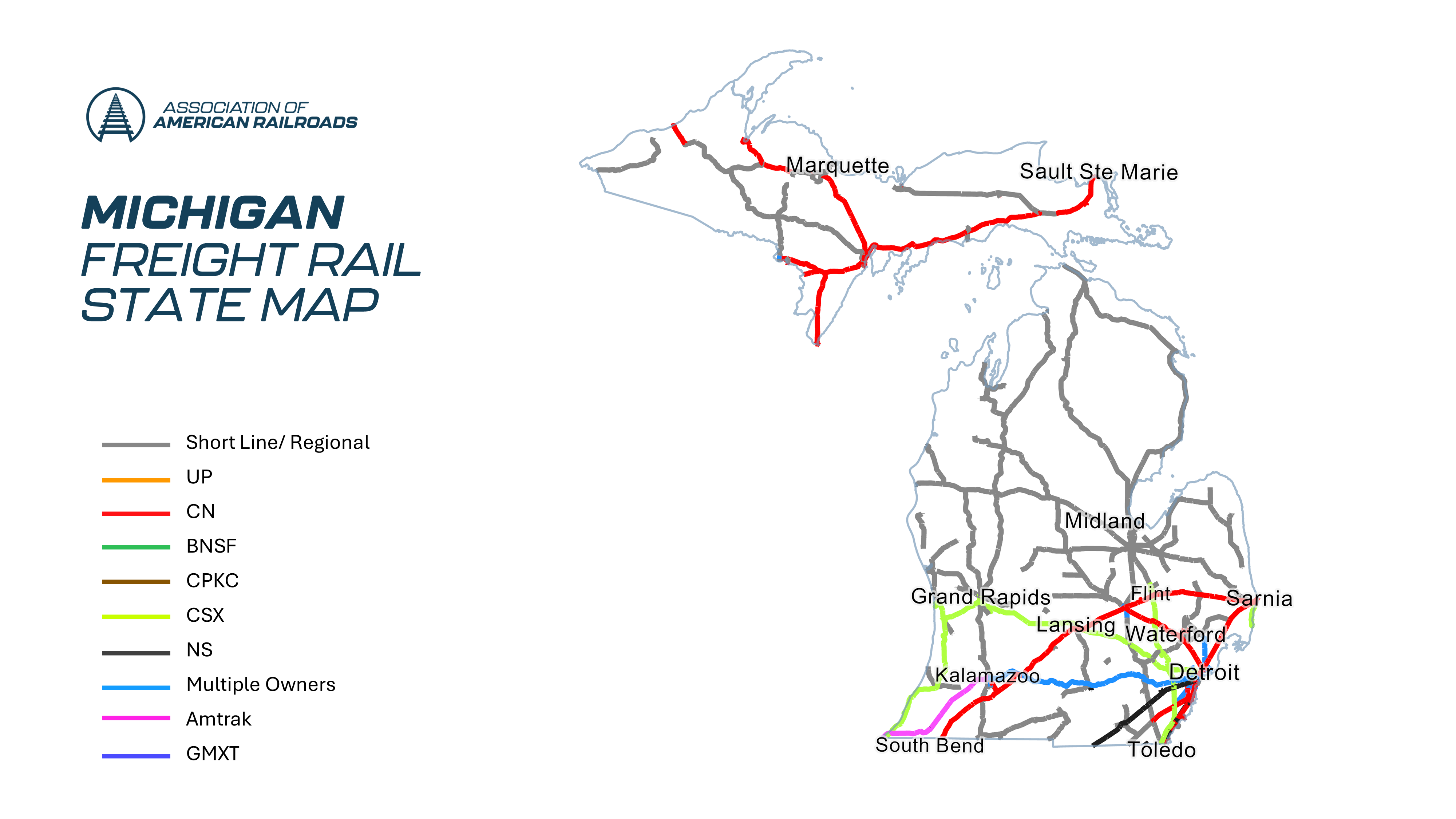 - Trucks off the Road: It would have taken 4.3 million trucks to handle the freight that moved by rail in Michigan in 2022.