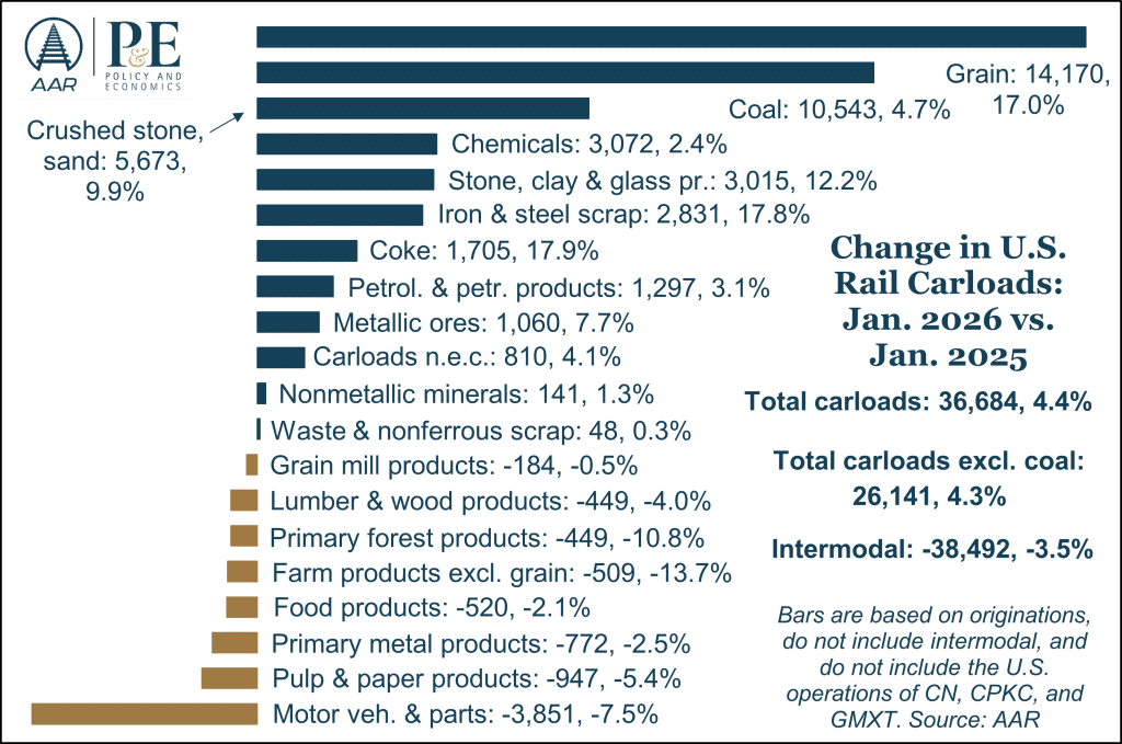 - Carload Rebound. January carloads rose 4.4% year-over-year, with gains in grain, coal, and other industrial products outweighing declines in automotive shipments.