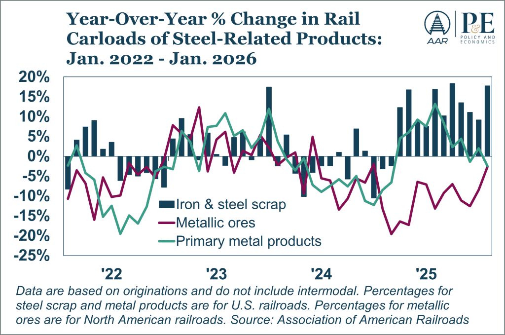 The sharp divergence between growing iron and steel scrap carloads and falling metallic ore carloads reflects continued cyclical and structural shifts in steelmaking. Domestic steel production has long been tilting toward electric‑arc furnaces, which use scrap rather than ore and can support rail movements even in a low‑growth manufacturing environment. Scrap is also domestically generated and rail‑friendly, while metallic ores are more exposed to blast‑furnace utilization (which has softened) and can bypass rail altogether via water-based supply chains. Together, these forces help explain why scrap volumes have strengthened even as ore traffic has weakened over the past couple of years.
