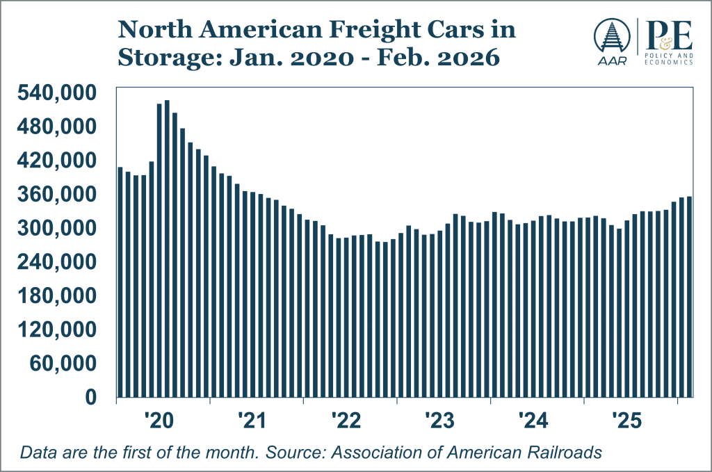 A railcar is considered in storage if it has not moved while loaded in the past 60 days and has only moved empty since its last loaded trip. Changes in the number of stored railcars are a real-time indicator of rail transportation demand and, by extension, broader economic activity. As of February 1, 2026, some 356,000 railcars — 21.8% of the 1.63 million North American freight car fleet — were in storage. The number of cars in storage has been slowly growing since mid-2025.