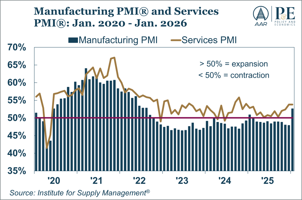 The overall U.S. economy can grow even if manufacturing is contracting, as the past few years have shown. Not so with services: because services account for roughly three‑quarters of U.S. GDP, even flat services output puts a low ceiling on overall growth. That’s why it’s good news that the ISM’s Services PMI® (like the Manufacturing PMI® except it covers services) was 53.8% in January, matching its highest level in a year. As we’ve noted before, railroads are more directly impacted by the goods/manufacturing side of the economy, but strength in services supports rail demand indirectly by sustaining incomes, construction, and goods consumption.