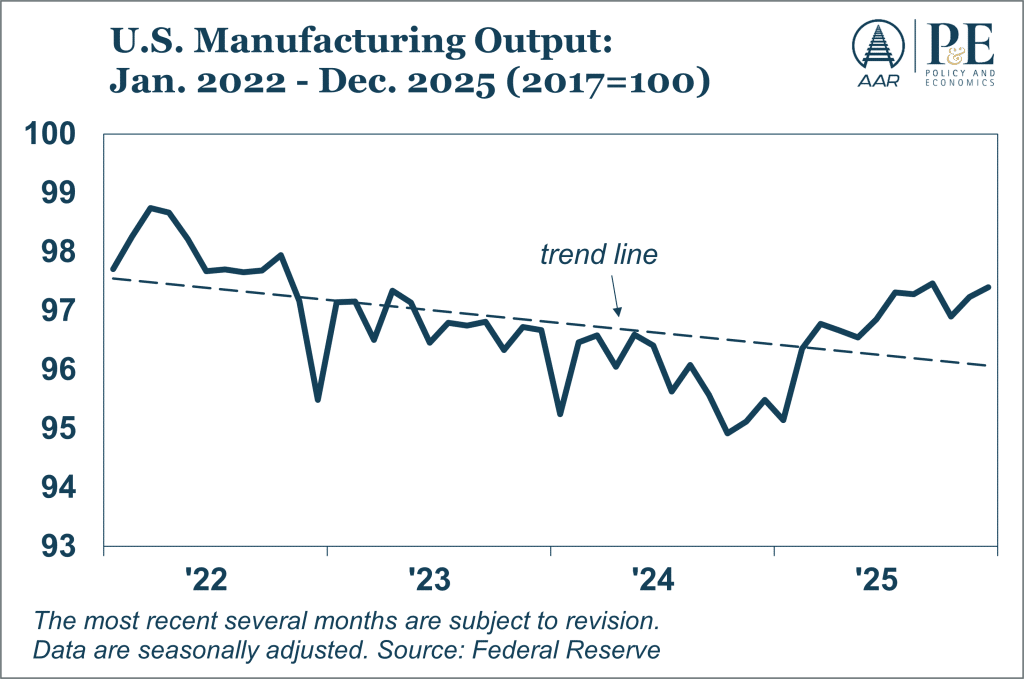 Meanwhile, Federal Reserve data show manufacturing output rose slightly in the second half of 2025, but the trend over the past several years has been slowly down. The hope, of course, is that January’s Manufacturing PMI® will be the start of a sustained turnaround that manifests itself in sustained gains in output. Time will tell, but until that happens, rail volumes will remain constrained.