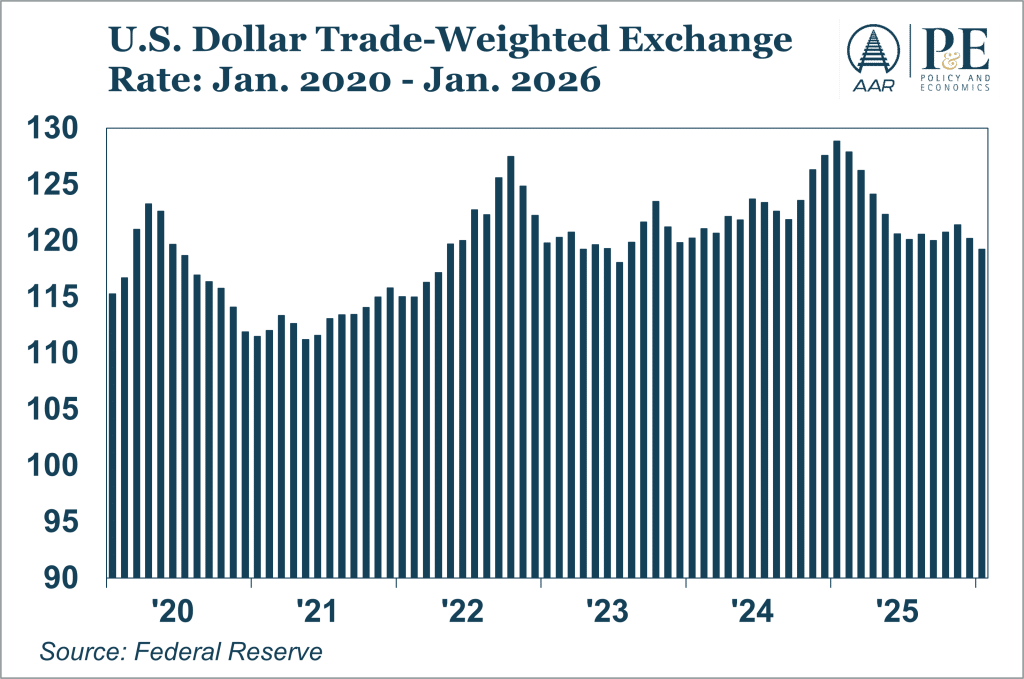 Over the past year, the U.S. dollar has fallen materially against a trade-weighted basket of major currencies. Fed interest rate cuts have reduced the dollar’s interest-rate advantage relative to some major countries. Trade policy uncertainty continues. And longer-standing concerns — including large, persistent federal budget deficits, geopolitical tensions, and a gradual effort by some countries to reduce reliance on the dollar in trade and reserves — have added downward pressure on the dollar. For freight railroads, a weaker dollar could provide a modest tailwind. All else equal, a weaker dollar means U.S. exports are less expensive abroad. This could support higher outbound volumes of commodities such as grain and coal. On the other hand, a weaker dollar means U.S. imports are more expensive, a potential headwind for imports of consumer goods and other products carried by rail.