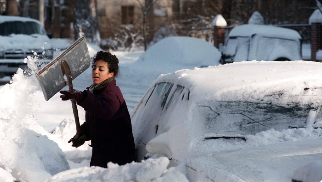 👆 A woman shovels the snow away from her car on Jan. 3, 1999, in front of her suburban Chicago home. Copyright The Chicago Tribune.