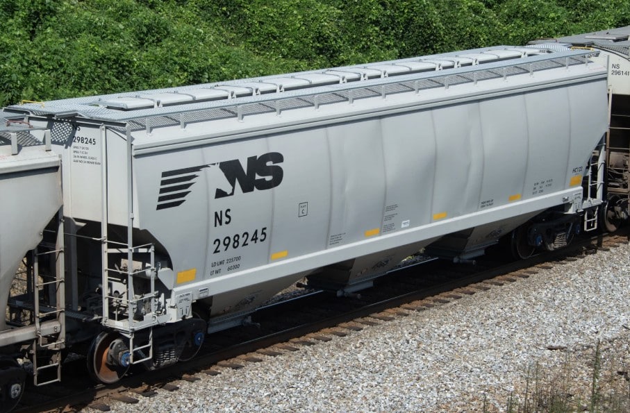 👆 Example of a modern covered hopper car from Norfolk Southern, capable of carrying 222,400 pounds, or about 19 African elephants!