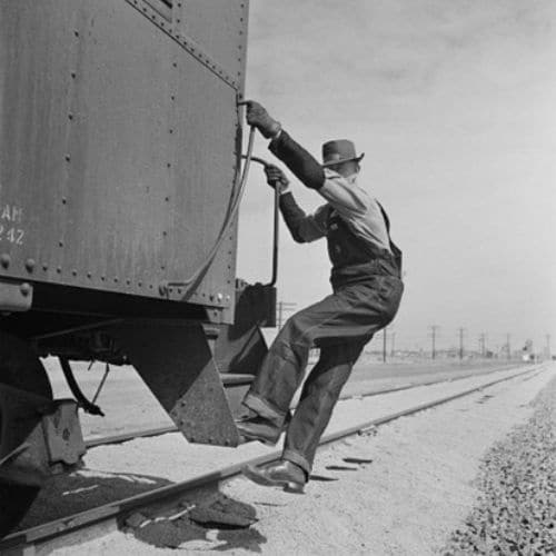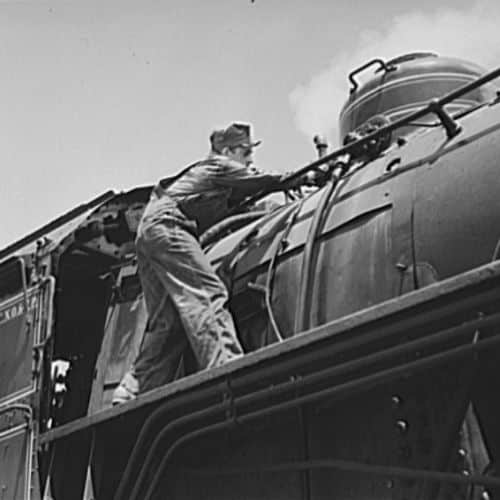 “Amarillo, Texas. R.W. Simmons, an Atchison, Topeka and Santa Fe engineer, boarding a caboose.” Jack Delano. March 1943 for the Office of War Information.