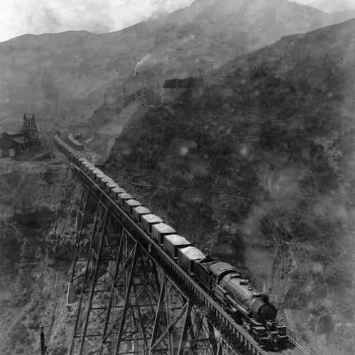 A train hauls copper ore over a high trestle at Bingham, Utah ca. 1914. Photo courtesy Western Mining History.