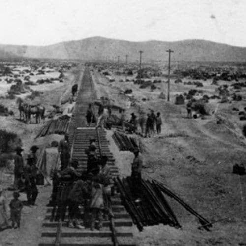 Central Pacific workers lay rail at the end of track, Humboldt Plains, Nevada. 1868. Courtesy of The Bancroft Library, University of California, Berkeley.