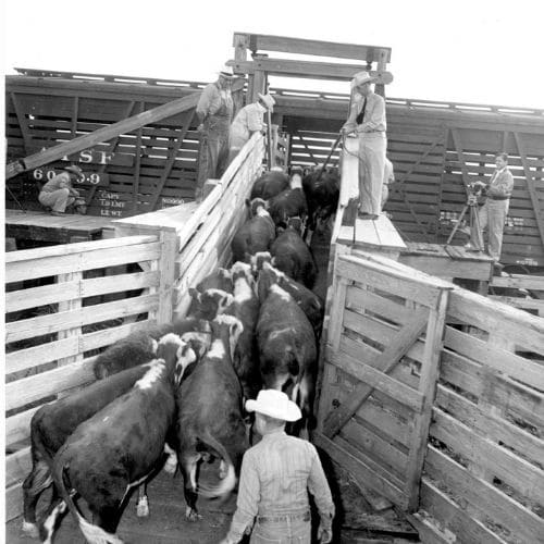Loading Cattle into Railroad Cars at the Stockyards, photograph, Date Unknown; University of North Texas Libraries, The Portal to Texas History, crediting Cattle Raisers Museum.