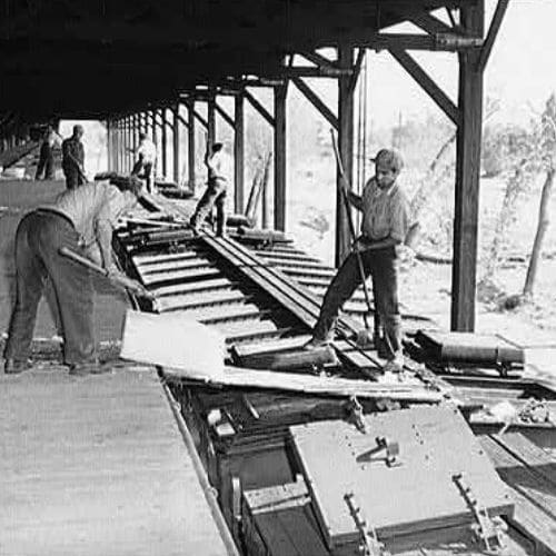Then: In the early days of freight rail, nearly every task depended on human muscle and experience. Goods were loaded and unloaded piece by piece—barrels, crates, sacks, and boxes handled manually at every transfer point—adding time, cost, and risk of damage. Brakemen climbed moving railcars to apply hand brakes in all weather, making one of the most dangerous jobs in railroading even riskier. At the same time, railroad networks themselves were built almost entirely by hand. From the 1820s through the late 1800s, crews graded land with picks and shovels, laid ties one by one, and spiked rails into place, creating tens of thousands of miles of track that formed the backbone of the nation’s freight system.