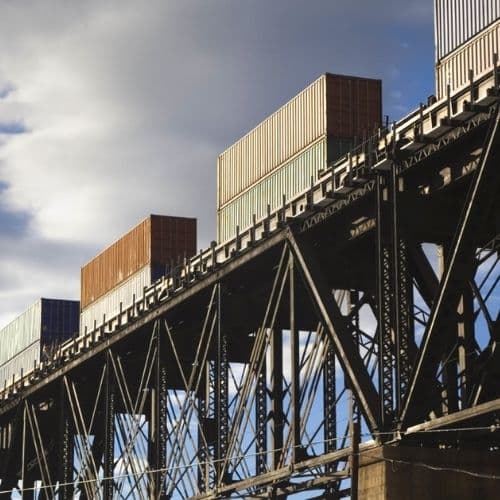 An intermodal train moves over a rail bridge. Intermodal is used to move almost anything that can fit into a container.