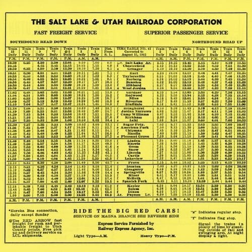 Inside of the Salt Lake and Utah Railroad’s timetable number 45. Showing the timetable for the mainline. Published in 1945, one year before the railroad was closed.